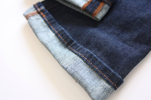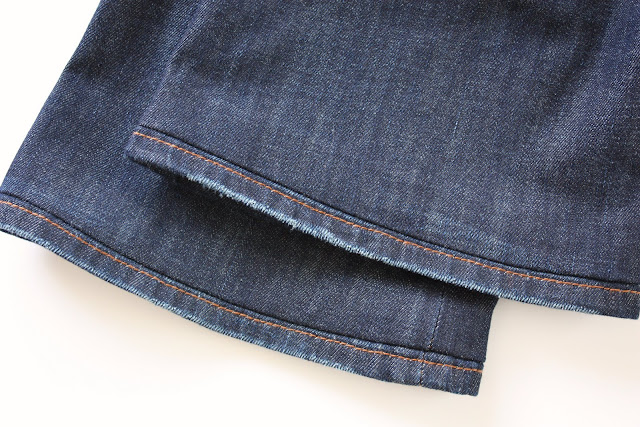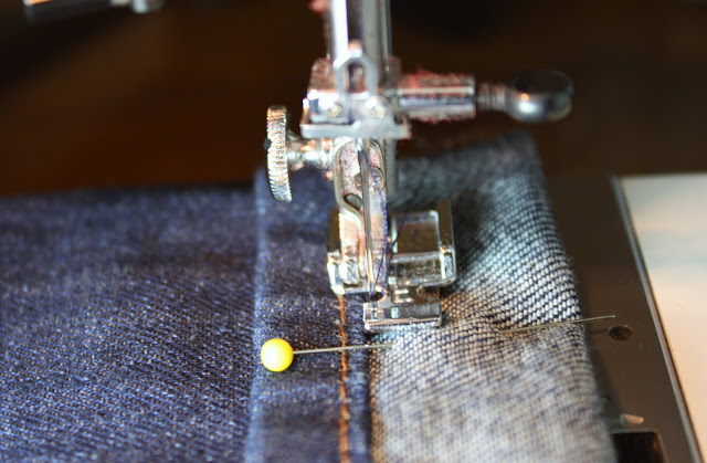 5. Agora costure a barra, nas duas camadas de jeans, beeeem pertinho da bainha original (mas não em cima tá!). Usar o pé de zíper da máquina é o ideal aqui. Confere a imagem: