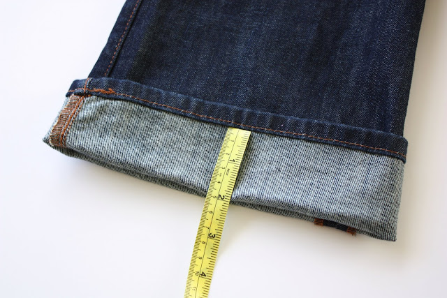 (na imagem, a medida está em polegadas, mas funciona da mesma maneira: ela dobrou o jeans 2 polegadas e dividindo por 2, fica com uma polegada). Vejam na imagem abaixo, como ela re-dobrou a bainha para cima, usando essa nova medida.