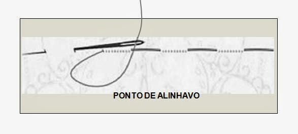 PONTO DE ALINHAVO-Este ponto é o mais simples e é usado para unir os tecidos em costura temporária enquanto se leva à máquina. Consiste em fazer uma linha tracejada com espaçamentos iguais por forma a segurar dois ou mais tecidos.