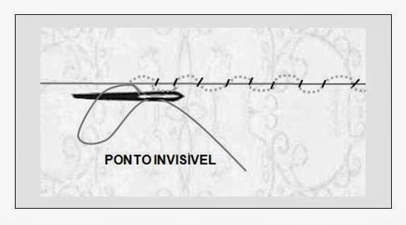 PONTO INVISÍVEL-Extremamente útil o ponto invisível resolve vários problemas. Feito com uma costura bem baixa, usa-se para unir duas bordas dobradas de tecido ou uma borda dobrada e uma bainha, ou para dar pontos finais em peças de artesanato. Devemos passar as dobras a ferro e esconder o nó na parte dobrada. Trazemos a agulha para a frente, pegamos poucos fios de tecido e retornamos para dentro da dobra. Voltamos com a agulha para fora e repetimos sucessivamente. A costura não deve aparecer pelo lado de fora, e os pontos maiores ficam do lado do avesso.